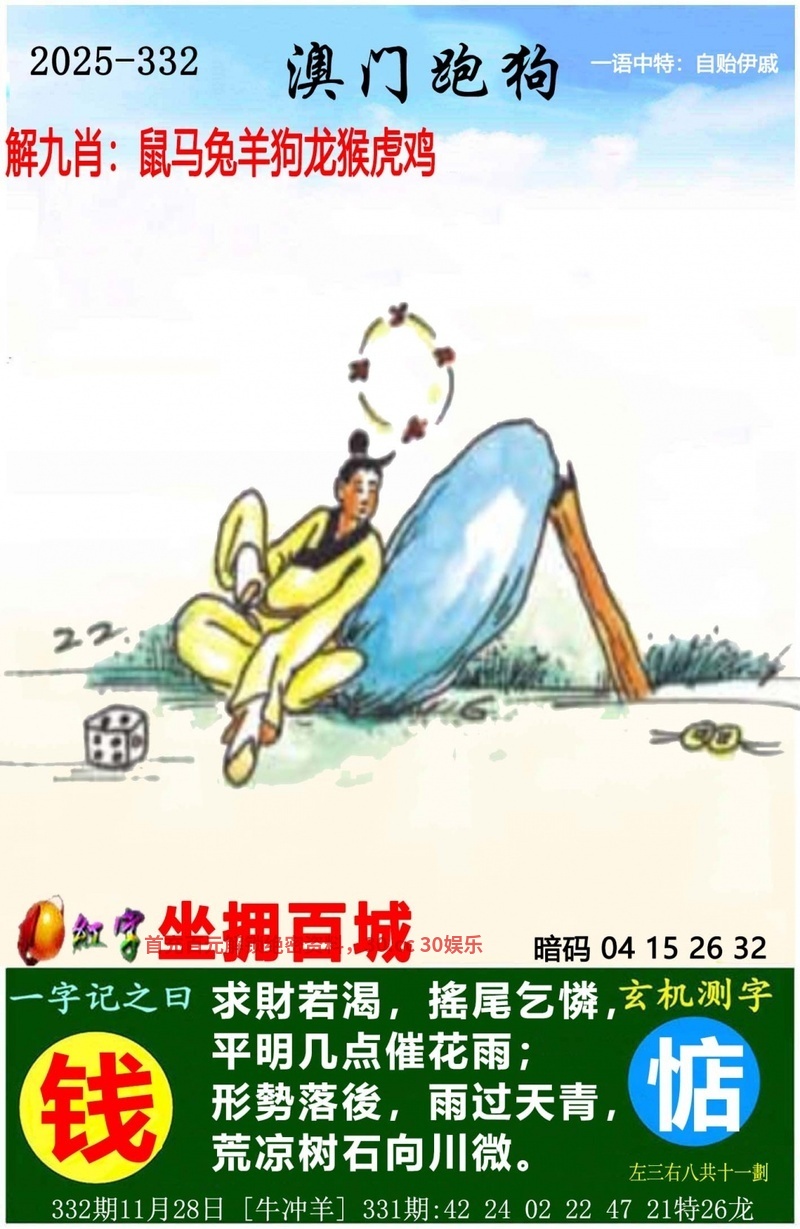 | 332期:【跑狗特码诗】开龙26 玄机诗云求財若渴,搖尾乞憐,平明几点催花雨;形勢落後,雨过天青,荒凉树石向川微。 诗句解图中是一个男子面前地上放着骰子靠在假山旁边看着左边地上的铜钱,解金肖猴鸡,坐拥百城。解大数热码25-49 |